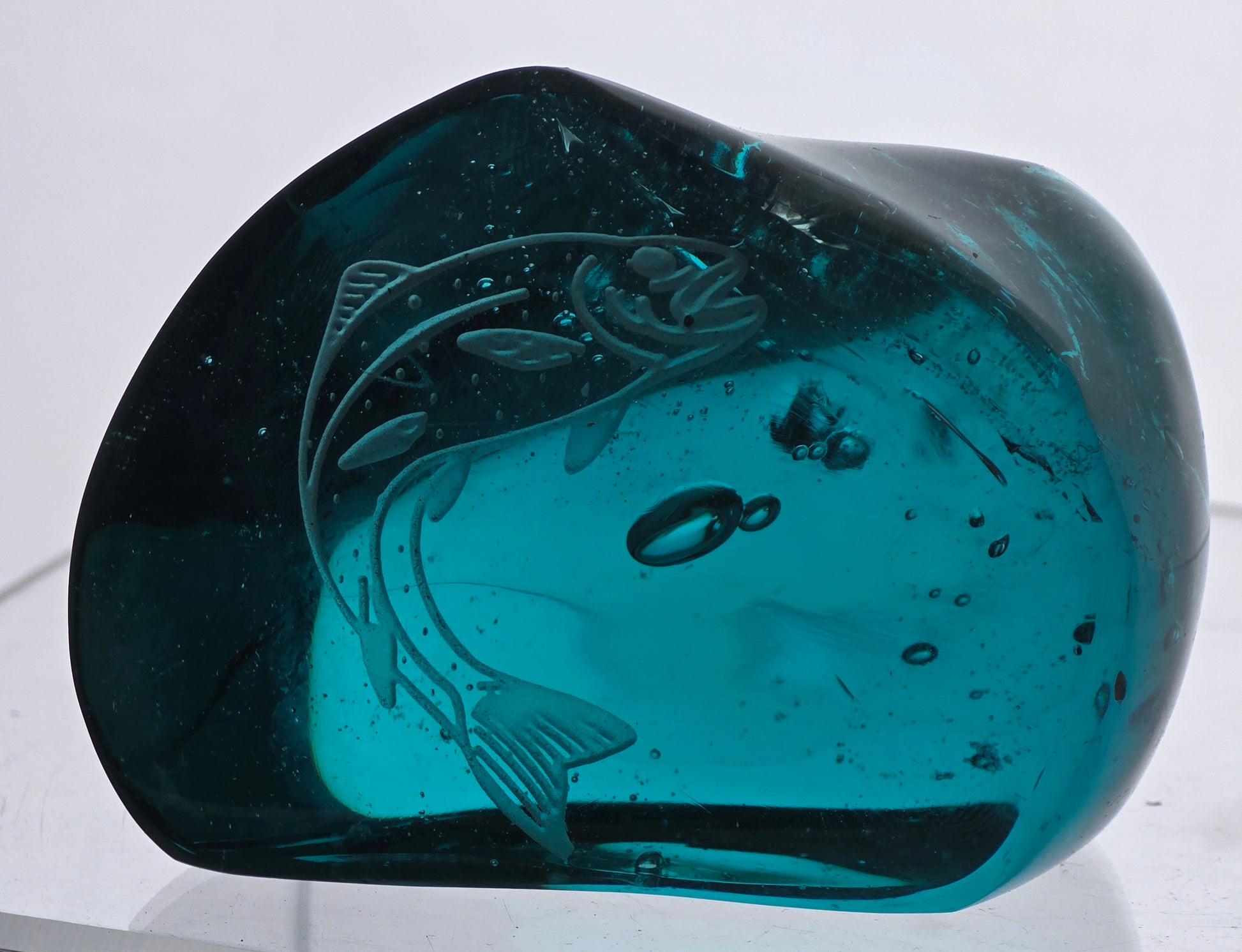 Hand crafted art glass paperweight from L.E. Smith Etched fish Glows