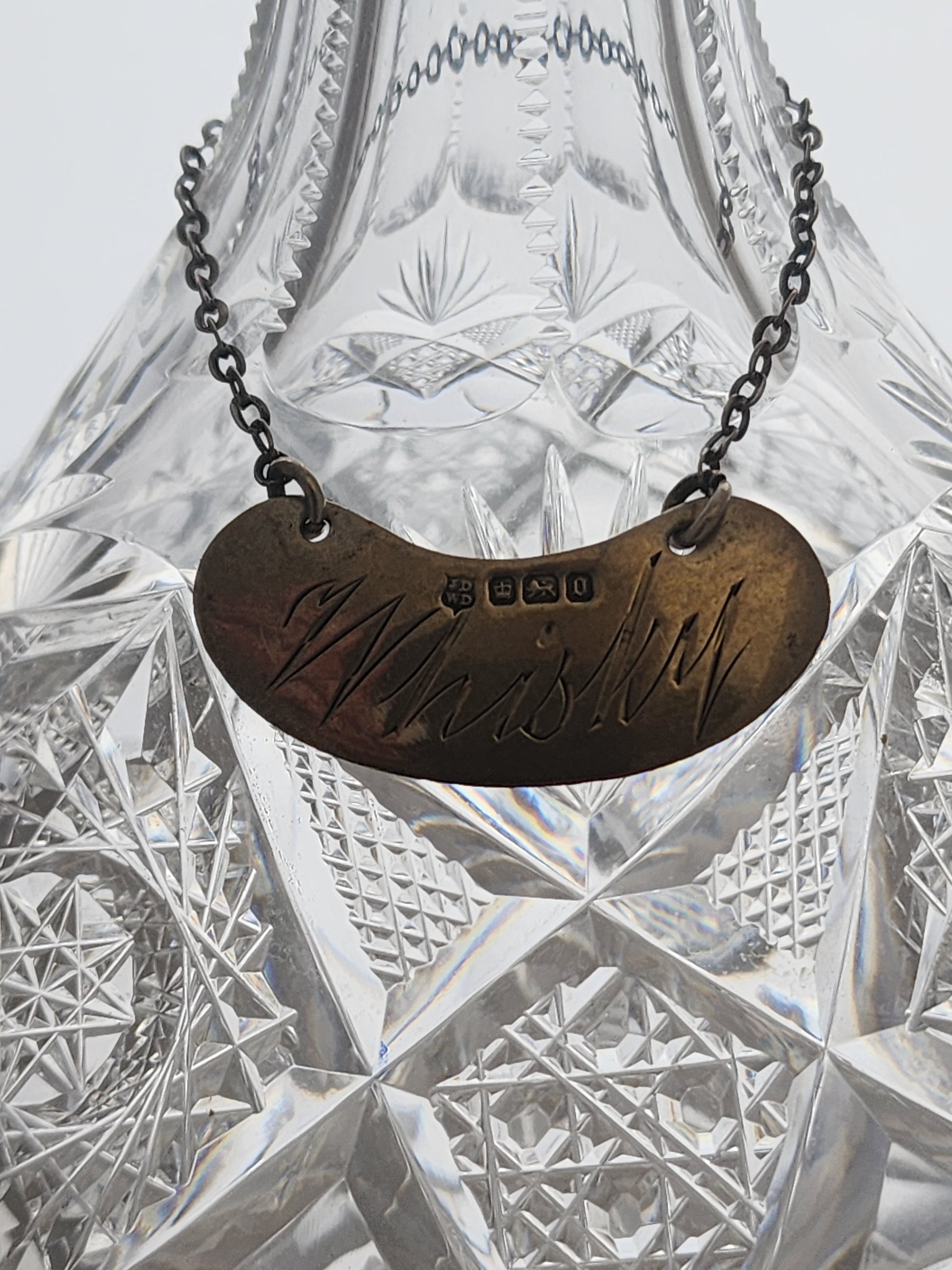 Antique cut glass mini decanter with silver whiskey tag,